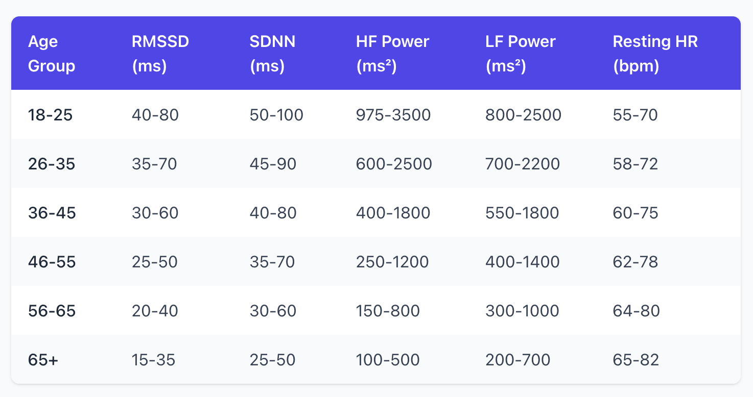 RMSSD: below 15-20 ms is concerning for most adults. Under 10 ms is red flag.